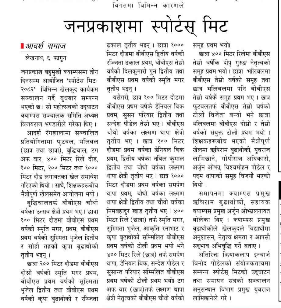 जनप्रकाशमा शैक्षिक वर्ष - २०८२ का खेलकूद कार्यक्रम का झलकहरु